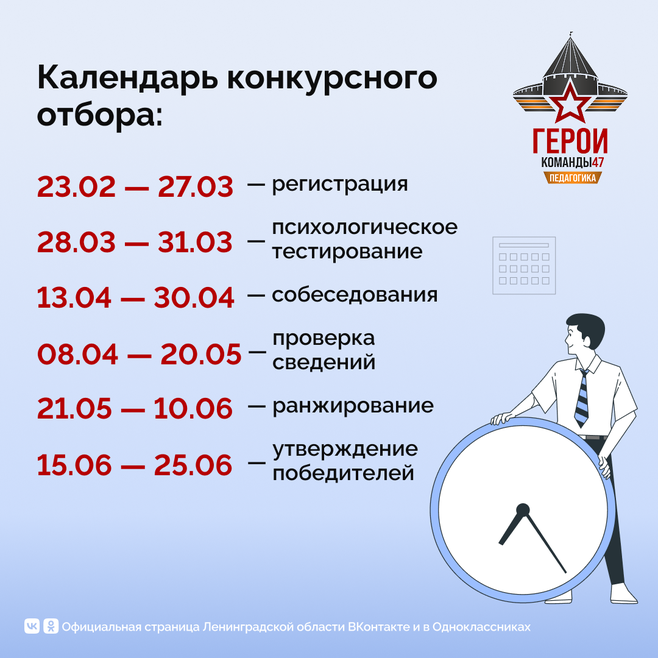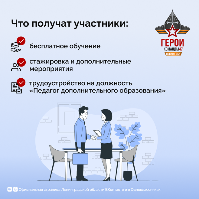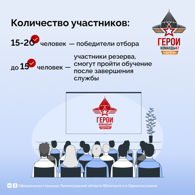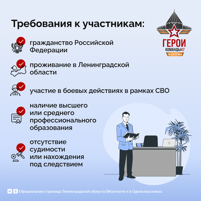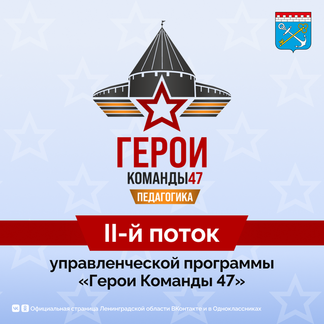 В соответствии с решением Общественного совета по реализации программы Ленинградской области «Герои Команды 47» с 23 февраля 2026 года запущен прием заявок на участие в конкурсном отборе второго потока программы по направлению «Педагогика» для участников и ветеранов специальной военной операции.